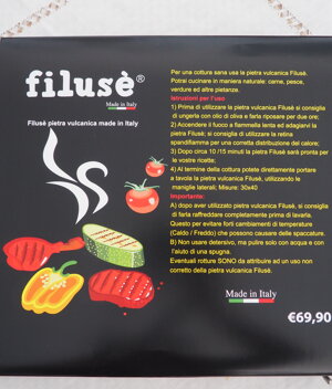 1) Prima di utilizzare la pietra vulcanica Filusè si consiglia di ungerla con olio di oliva e farla riposare per due ore;